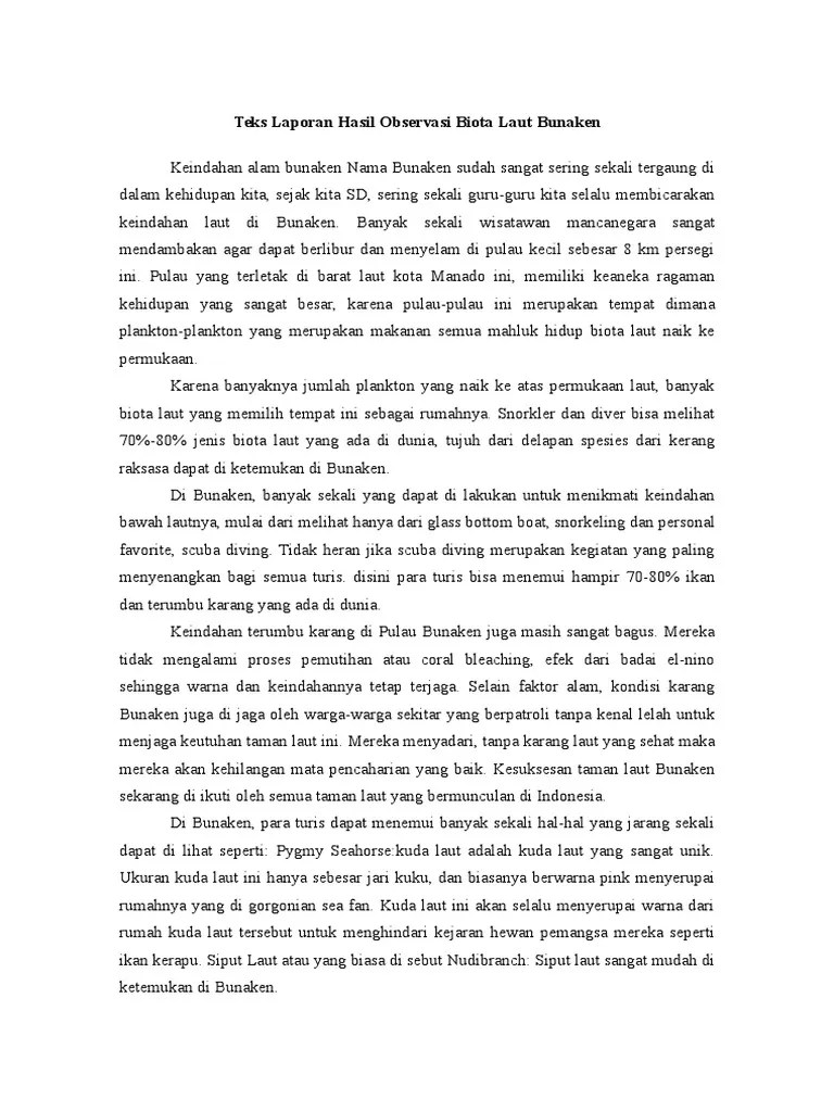 Teks laporan hasil observasi adalah tulisan hasil pengamatan atas suatu hal. Kumpulan contoh teks laporan hasil observasi yang baik dan benar tentang hewan, tumbuhan, alam, fenomena, keindahan, bencana, sampah dll. Sedangkan, untuk teks hasil observasi memiliki pengertian yaitu isi teks yang menjelaskan suatu informasi baik itu informasi tentang hewan, . Binatang langka, tumbuhan, sampah ditulis dengan singkat, sederhana dan . Contoh teks laporan hasil observasi beserta strukturnya dengan tema: