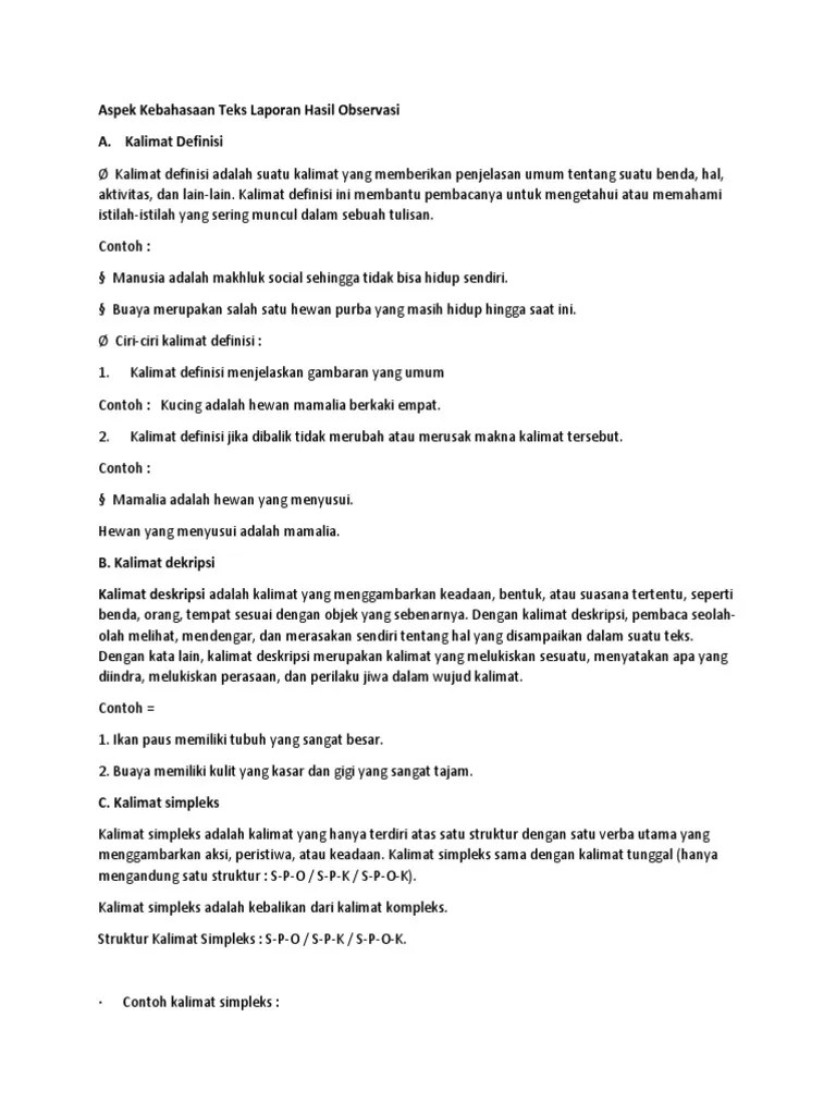 Tuliskan Aspek Kebahasaan Teks Laporan Hasil Observasi / Analisis Kebahasaan Teks Laporan Hasil Observasi Rasanya : Pengertian, contoh, struktur, ciri, kaidah kebahasaan, fungsi, tujuan, langkah menyusun .. 3.2 menganalisis isi dan aspek kebahasaan dari minimal dua teks laporan hasil observasi. Mengapa dunia pendidikan menghadapi masalah sulit? Sedang ada tugas membuat laporan hasil observasi? Agar lebih jelas, yuk kita lihat contoh dan penjelasannya. Nurlela, linda (2021) peningkatan kemampuan menelaah struktur dan aspek kebahasaan serta menyajikan rangkuman teks laporan hasil observasi .