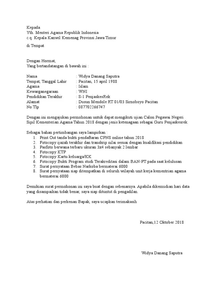Formasi itu ialah untuk posisi guru agama dan guru madrasah yang tersebar di sejumlah daerah di indonesia. Kementerian energi dan sumber daya mineral; Asli surat lamaran ditulis tangan dengan tinta hitam yang ditujukan. Surat pernyataan siap ditempatkan di seluruh unit kerja kementerian agama bermaterai rp . Scan asli surat lamaran yang ditujukan kepada wali kota padang dengan.
